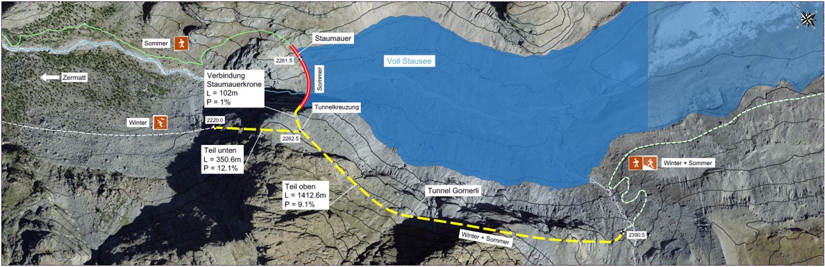 Le projet Gornerli aura pour conséquence un lac plus grand dont le niveau variera au cours de l’année. La descente à ski en direction de Zermatt se fait actuellement, à la bonne saison, par la gorge dans laquelle sera construit le barrage, qui ne sera plus praticable à cet endroit. Depuis début 2024, le maître d’ouvrage ainsi que des représentantes et représentants des guides de montagne, du Club Alpin Suisse et de la Commune de Zermatt collaborent étroitement au sein du Dialog Gornerli pour définir une solution simple permettant de faciliter le retour vers Zermatt. La variante d’un tunnel d’environ 1,5 kilomètre de long est actuellement privilégiée.